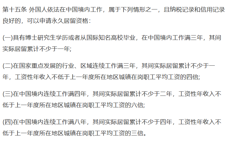 第三个途径是通过长期工作获得资格。大致上申请者要有博士学历或从国际知名高校毕业,在中国境内工作满三年到八年,工资要是所在地平均工资的三到六倍,工作年限越短,工资就要越高。比如,上海平均工资大概一年10万,一个外国人在上海连续工作四年,工资要达到60万才有资格申请。而且,这还是最低要求,各地区政府还可以加码。