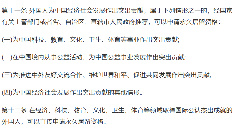 第一个途径是杰出人士。外国人为中国经济社会发展作出突出贡献,经国家有关主管部门或者省、自治区、直辖市人民政府推荐,可以申请永久居留资格;在经济、科技、教育、文化、卫生、体育等领域取得国际公认杰出成就的外国人,可以直接申请永久居留资格。