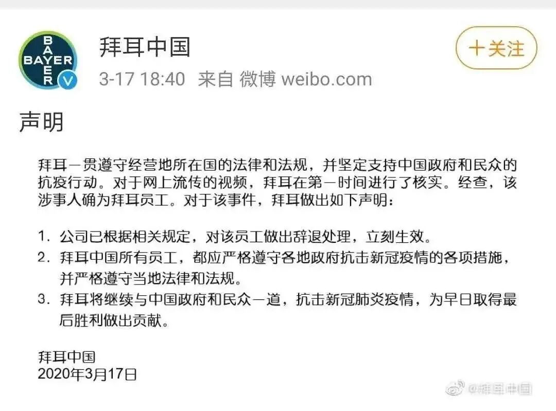 拜耳中国在官微声明中说,称拜耳一贯遵守经营地所在国的法律法规,并坚定支持中国抗疫行动。经核查,网上流传视频涉事人的确为拜耳员工。拜耳已根据相关规定,对该员工做出辞退处理,即刻生效。