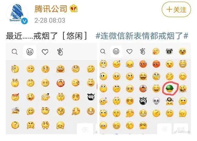 2月28日,腾讯公司官方微博表示:“戒烟了”。随即,许多微信用户发现:微信表情中,那个戴着绿色头盔的小黄人,嘴里叼着的雪茄不见了。很快,这一消息迅速冲上多个热搜榜,成为舆论关注的焦点。